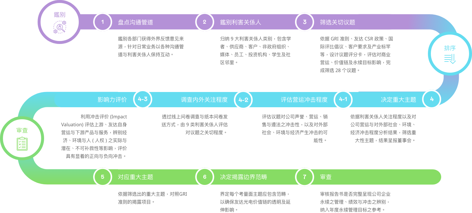 | 人才吸引及留任 | 提供员工公平完善的薪酬福利与职能训练,使人力稳定且具吸引力,创造盈利能力 | 4.2 人才吸引与留任 4.3 人才发展 |